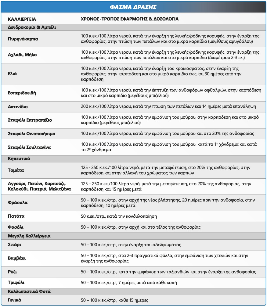 - Δεν επηρεάζει αρνητικά τα φυτά προκαλώντας μειωμένη απόδοση ή ανομοιόμορφη έκπτυξη οφθαλμών της επόμενης χρονιάς και πρόωρη γήρανση