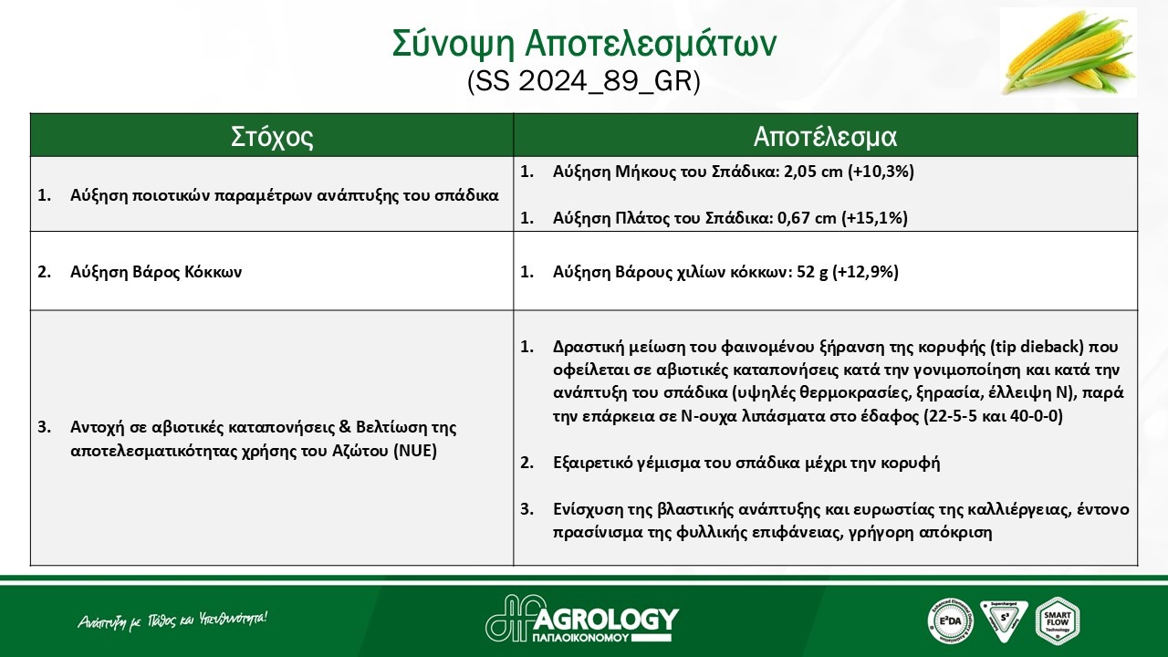 Κατά τη διάρκεια του αποδεικτικού αγρού, πραγματοποιήθηκαν δειγματοληψίες στις δύο μεταχειρίσεις, Μάρτυρα και Προγράμματος Agrology. Ως αποτέλεσμα, το Πρόγραμμα Agrology επέφερε εντυπωσιακά αποτελέσματα στα αγρονομικά χαρακτηριστικά στην καλλιέργεια Αραβοσίτου, προς όφελος του παραγωγού.