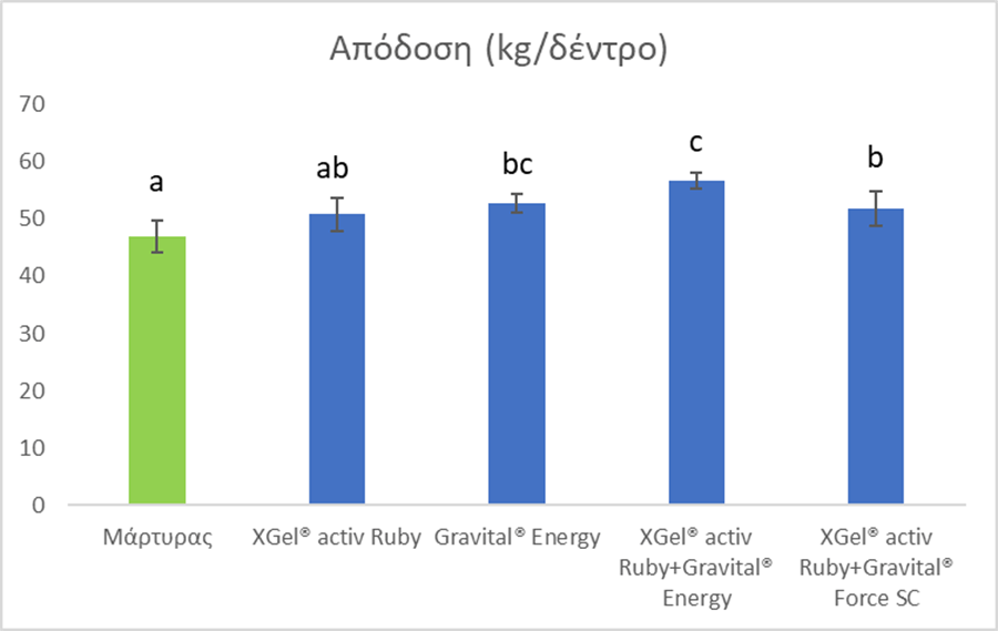 Καταγράφηκε αύξηση της απόδοσης των ελαιόδεντρων στις μεταχειρίσεις 3, 4 και 5, σε σχέση με τον Μάρτυρα. Οι επεμβάσεις με το πυριτικό σκεύασμα Gravital® Energy καθώς και η προσθήκη του καλιούχου λιπάσματος XGel® activ Ruby συνέβαλαν σε σημαντική αύξηση της απόδοσης κατά 21%, σε σχέση με τον Μάρτυρα (Εικόνα 4).