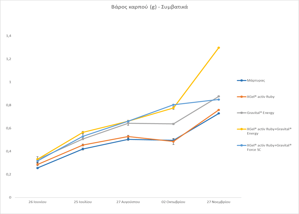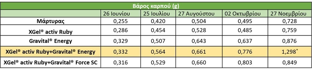 Καταγράφηκε σταδιακή αύξηση του βάρους των καρπών, σε σχέση με το Μάρτυρα στις μεταχειρίσεις 3, 4 και 5. Εφαρμόστηκαν τα σκευάσματα Gravital® Energy και Gravital® Force SC με την προσθήκη του καλιούχου XGel® activ Ruby. Η μεγαλύτερη αύξηση καταγράφηκε την ημέρα της συγκομιδής στην 4η μεταχείριση, όπου εφαρμόστηκαν τα XGel® activ Ruby και Gravital® Energy, και ήταν της τάξης του 78%, σε σχέση με το Μάρτυρα (Εικόνα 3).
