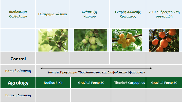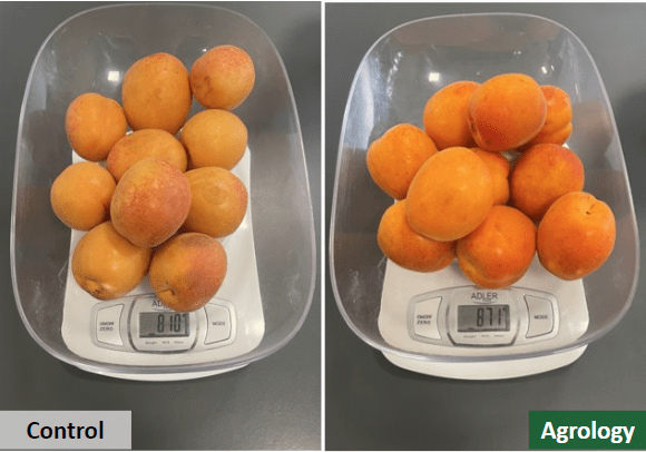 Κατά τη διάρκεια του αποδεικτικού αγρού, πραγματοποιήθηκαν δειγματοληψίες στις δύο μεταχειρίσεις, Μάρτυρα και Προγράμματος Agrology. Ως αποτέλεσμα, το Πρόγραμμα Agrology επέφερε εντυπωσιακά αποτελέσματα στα αγρονομικά χαρακτηριστικά στην καλλιέργεια βερίκοκου, προς όφελος του παραγωγού.