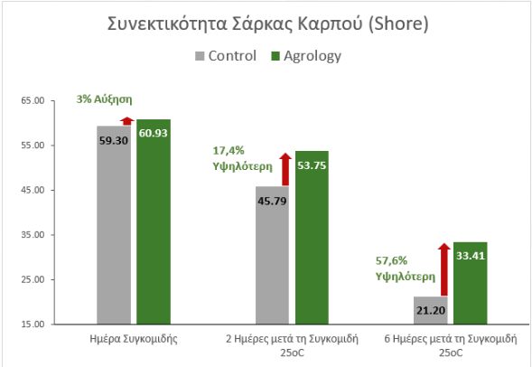 - Αύξηση της Συνεκτικότητας Σάρκας Καρπών – Ημέρα Συγκομιδής: +3%