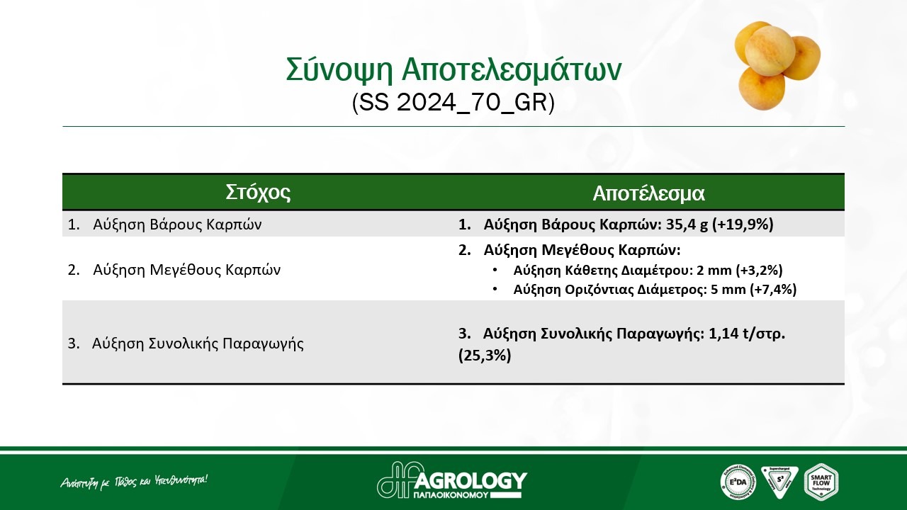 Κατά τη διάρκεια του αποδεικτικού αγρού, πραγματοποιήθηκαν δειγματοληψίες στις δύο μεταχειρίσεις, Μάρτυρα και Προγράμματος Agrology και μετρήθηκε η συνολική παραγωγή. Ως αποτέλεσμα, το Πρόγραμμα Agrology επέφερε εντυπωσιακά αποτελέσματα στα αγρονομικά χαρακτηριστικά στην καλλιέργεια Βιομηχανικού Ροδάκινου, προς όφελος του παραγωγού.