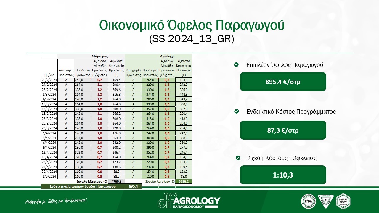Τελικός στόχος μας είναι να καταδείξουμε πως τα Προγράμματα Λειτουργικής Θρέψης Καλλιεργειών® της Agrology, αποτελούν μια κερδοφόρα επένδυση για τους παραγωγούς, καθώς τα οικονομικά οφέλη για τους ίδιους είναι πολλαπλάσια από το κόστος των συμπληρωματικών εφαρμογών!