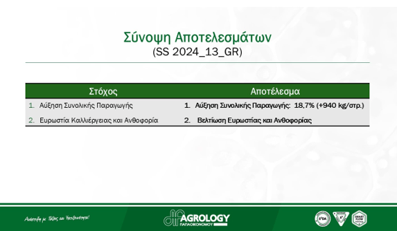 - 2-5 κλούβες κατά μέσο όρο περισσότερη παραγωγή στη μεταχείριση Agrology