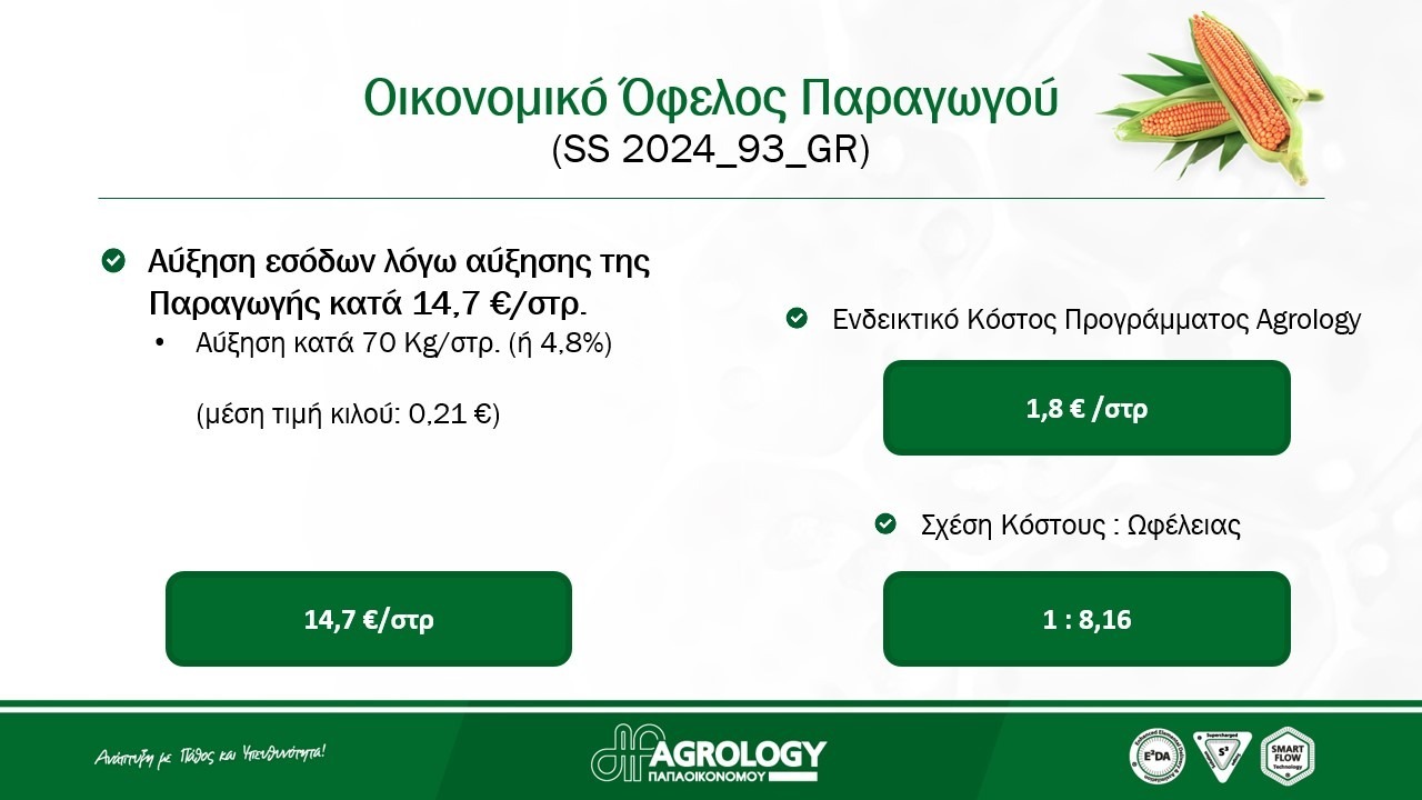 Τελικός στόχος μας είναι να καταδείξουμε πως τα Προγράμματα Λειτουργικής Θρέψης Καλλιεργειών® της Agrology, αποτελούν μια κερδοφόρα επένδυση για τους παραγωγούς, καθώς τα οικονομικά οφέλη για τους ίδιους είναι πολλαπλάσια από το κόστος των συμπληρωματικών εφαρμογών!