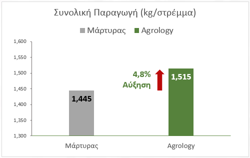 1. Αύξηση 4,8% (70 kg/στρέμμα) κατά μέσο όρο, της Παραγωγής συγκριτικά με το Μάρτυρα: