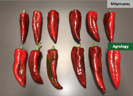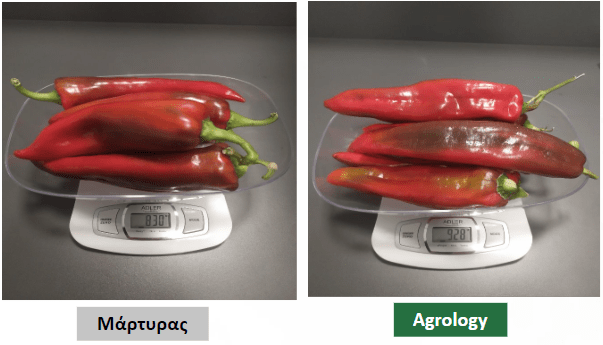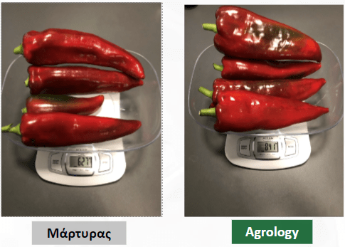 Κατά τη διάρκεια των αποδεικτικών αγρού, πραγματοποιήθηκαν δειγματοληψίες στις δύο μεταχειρίσεις, Μάρτυρα και Προγράμματος Agrology. Ως αποτέλεσμα, το Πρόγραμμα Agrology επέφερε εντυπωσιακά αποτελέσματα στα αγρονομικά χαρακτηριστικά στην καλλιέργεια Πιπεριάς Θερμοκηπίου, προς όφελος του παραγωγού.