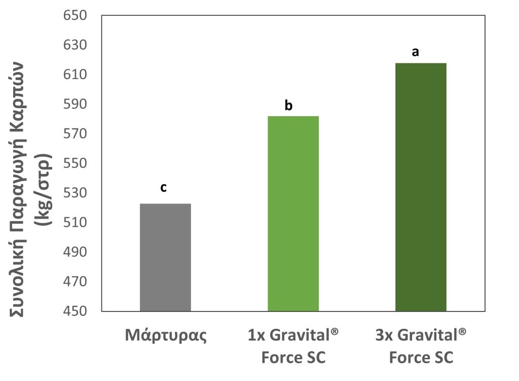 Καταγράφηκε στατιστικώς σημαντική διαφορά όσο αφορά τη συνολική παραγωγή στις μεταχειρίσεις 2 και 3, σε σχέση με τον Μάρτυρα.