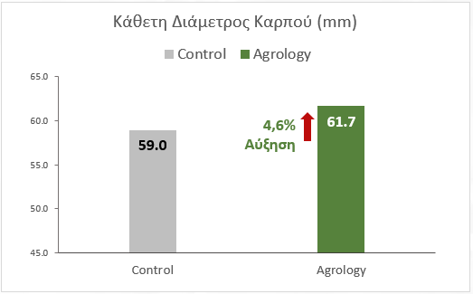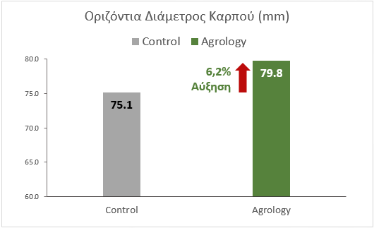 *Παρά την μικρή (φαινομενικά) αύξηση διαμέτρων, η αύξηση βάρους ανά καρπό είναι μεγάλη και οδηγεί σε πολύ σημαντική αύξηση της συνολικής παραγωγής