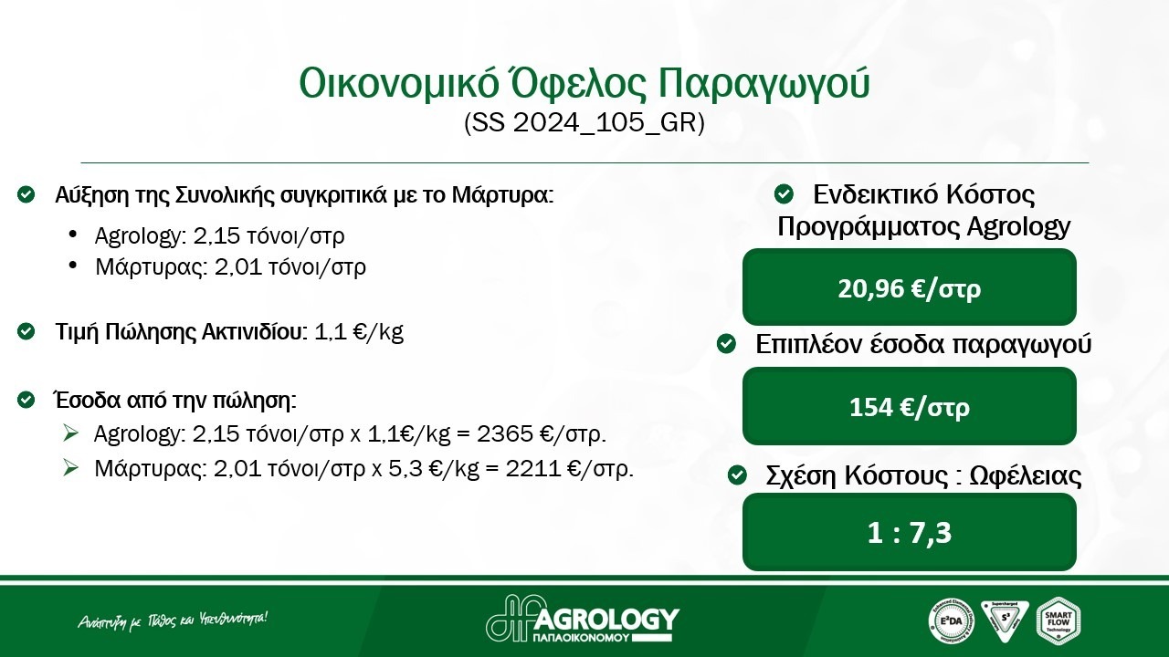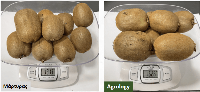 Κατά τη διάρκεια των αποδεικτικών αγρού, πραγματοποιήθηκαν δειγματοληψίες στις δύο μεταχειρίσεις, Μάρτυρα και Προγράμματος Agrology. Επίσης, μετρήθηκε η συνολική παραγωγή και στις 2 μεταχειρίσεις. Ως αποτέλεσμα, το Πρόγραμμα Agrology επέφερε εντυπωσιακά αποτελέσματα στα αγρονομικά χαρακτηριστικά στην καλλιέργεια Ακτινιδίου, προς όφελος του παραγωγού.