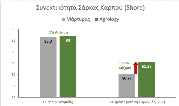 Διατήρηση της Συνεκτικότητας Σάρκας Καρπών – 30 ημέρες μετά τη Συγκομιδή σε Θερμοκρασία δωματίου (25±1 οC): +38,7%