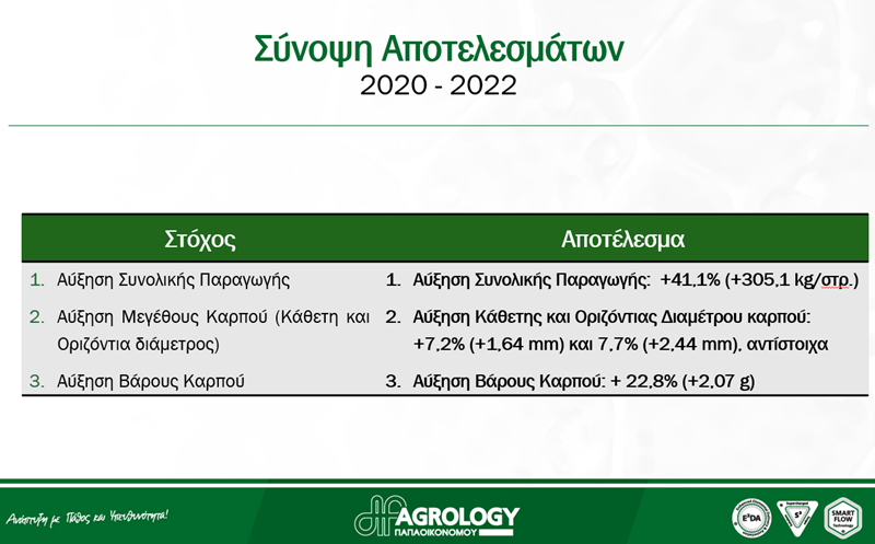 Κατά τη διάρκεια των αποδεικτικών αγρού, πραγματοποιήθηκαν δειγματοληψίες στις δύο μεταχειρίσεις, Μάρτυρα και Προγράμματος Agrology, ενώ προσδιορίστηκε επίσης, η τελική απόδοση, την περίοδο συγκομιδής. Ειδικότερα, το Πρόγραμμα Agrology επέφερε εντυπωσιακά αποτελέσματα στα αγρονομικά χαρακτηριστικά στην επιτραπέζια ελιά, προς όφελος του παραγωγού.