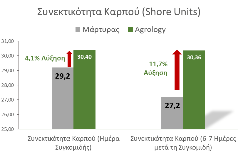 3. Αύξηση Συνεκτικότητας Σάρκας Καρπών κατά 11,7%, 6 ημέρες μετά τη συγκομιδή (συντήρηση σε ψυγείο 4-6o C)