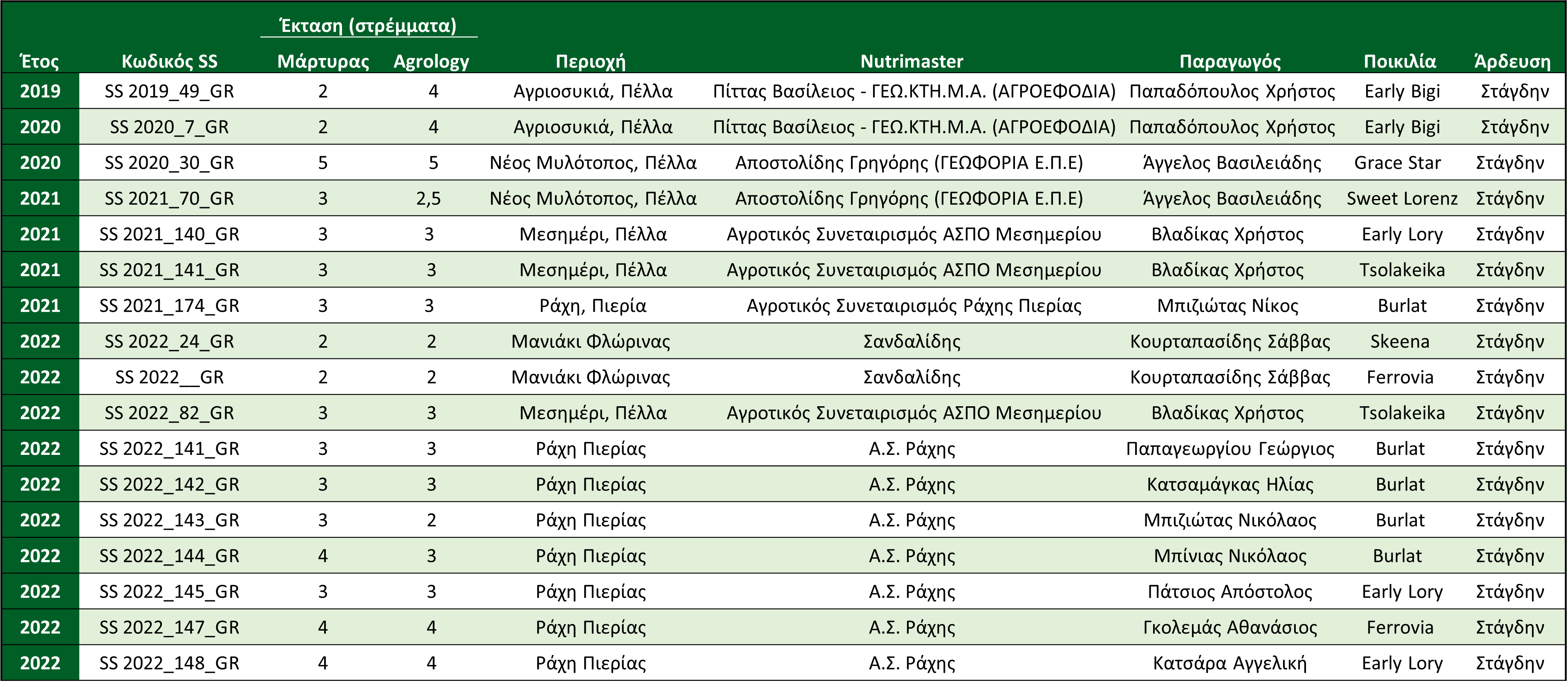 Πραγματοποιήθηκαν συνολικά 17 αποδεικτικά αγρού συνολικής έκτασης 83 στρεμμάτων, σε διάφορες περιοχές της Ελλάδας, σε ποικιλίες κερασιού, τα έτη 2019-2022.