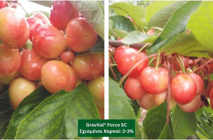 Ο Βιοδιεγέρτης πυριτίου και ασβεστίου Gravital® Force SC περιόρισε το φαινόμενο του Σχισίματος των Καρπών σε χαμηλά ποσοστά, όταν εφαρμόστηκε διαφυλλικά στις εξής περιπτώσεις: