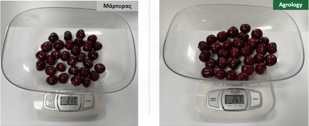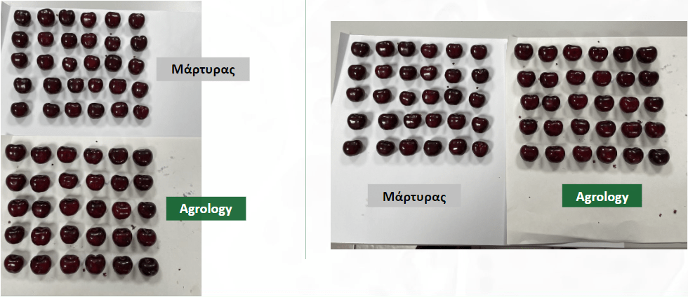 Κατά τη διάρκεια του αποδεικτικού αγρού, πραγματοποιήθηκαν δειγματοληψίες στις δύο μεταχειρίσεις, Μάρτυρα και Προγράμματος Agrology. Ως αποτέλεσμα, το Πρόγραμμα Agrology επέφερε εντυπωσιακά αποτελέσματα στα αγρονομικά χαρακτηριστικά στην καλλιέργεια Κερασιού​, προς όφελος του παραγωγού.