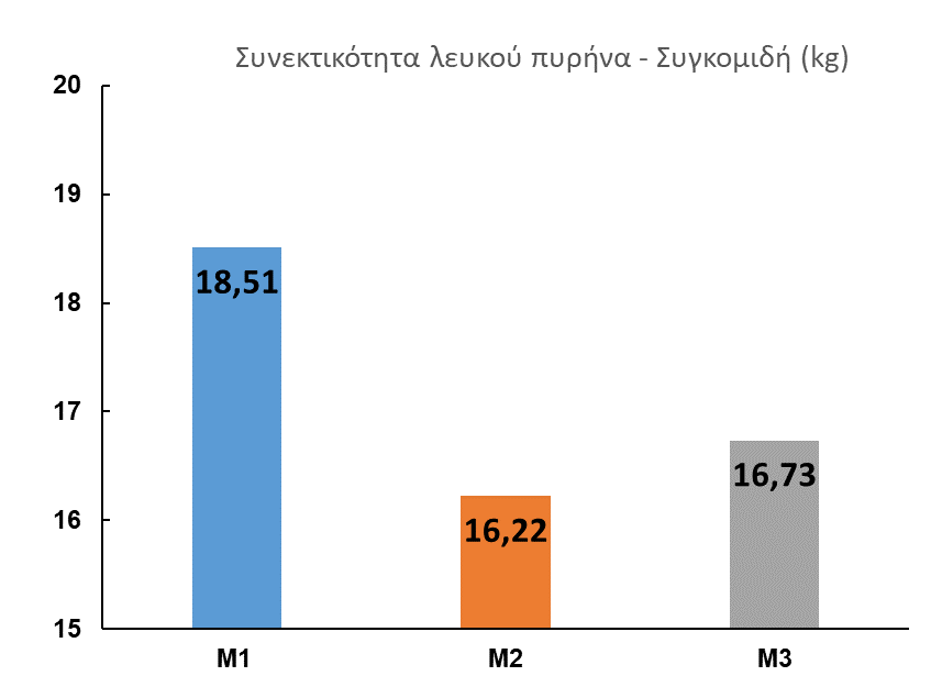Εικόνα 6. Συνεκτικότητα λευκού πυρήνα (kg), κατά τη Συγκομιδή στις 3 μεταχειρίσεις