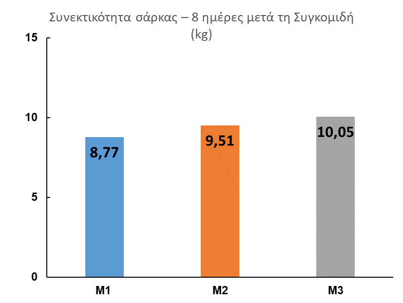 Εικόνα 5. Συνεκτικότητα Σάρκας καρπού (Kg), 8 ημέρες μετά τη Συγκομιδή στις 3 μεταχειρίσεις